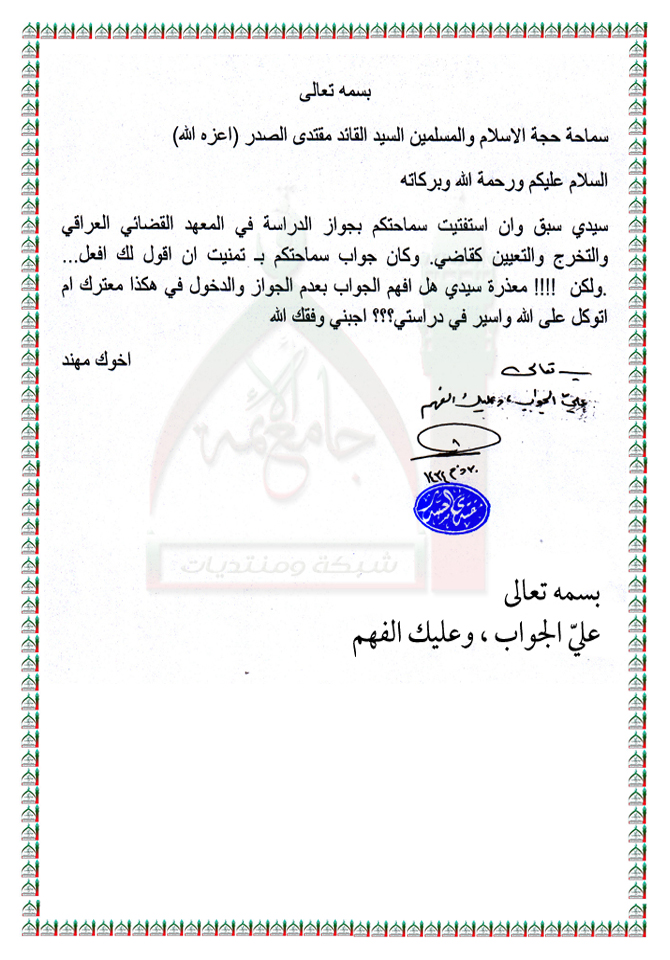 الدراسة في المعهد القضائي العراقي استفتاء السيد القائد مقتدى الصدر اعزه الله 5 - 11 - 2013