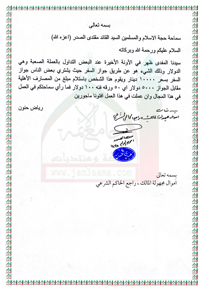 الاموال المجهولة المالك استفتاء السيد القائد مقتدى الصدر 6 - 11 - 2013