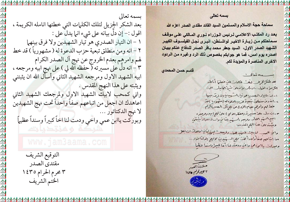 السيد القائد مقتدى الصدر اعزه الله يجيب على استفتاء بخصوص رد السيد جعفر الصدر على بيان مكتب المالكي 8 / 11 / 2013