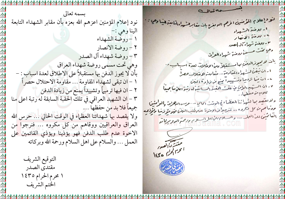 الدفن في روضة شهداء العراق بيان السيد القائد مقتدى الصدر اعزه الله 8 / 11 / 2013