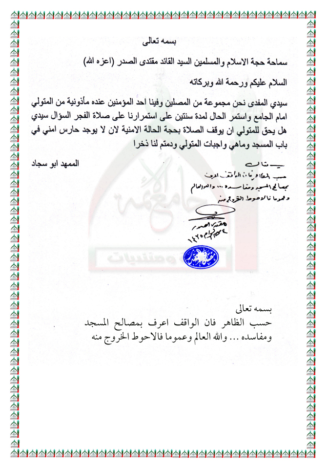 احقية المتولي بوقف الصلاة بحجة الحالة الامنية استفتاء السيد القائد مقتدى الصدر اعزه الله 9 - 11 - 2013