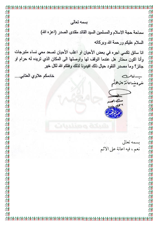 حكم صعود نساء متبرجات مع سائق التكسي استفتاء السيد القائد مقتدى الصدر اعزه الله 9 - 11 - 2013
