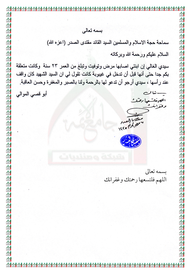اب يطلب الدعاء بالرحمة والمغفرة لابنته المتوفاة استفتاء السيد القائد مقتدى الصدر اعزه الله 12 - 11 - 2013