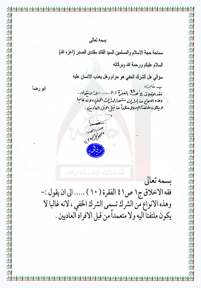 الشرك الخفي استفتاء السيد القائد مقتدى الصدر اعزه الله 16 - 11 - 2013