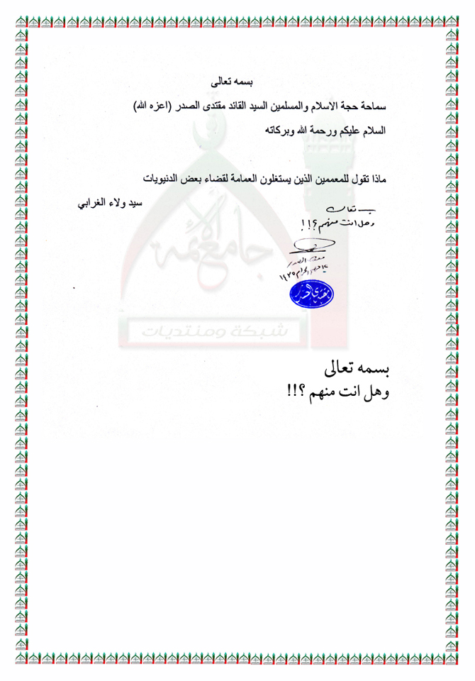 المعممين الذين يستغلون العمامة للامور الدنيوية استفتاء السيد القائد مقتدى الصدر اعزه الله 17 - 11 - 2013