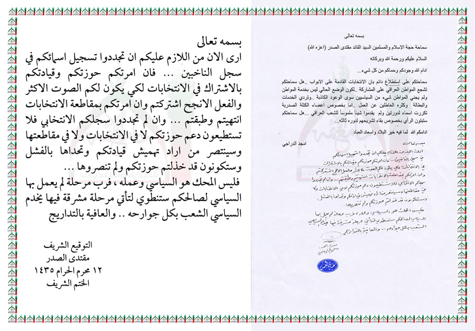 ارى من اللازم عليكم تحديث سجل الناخبين استفتاء السيد القائد مقتدى الصدر اعزه الله 17 - 11 - 2013