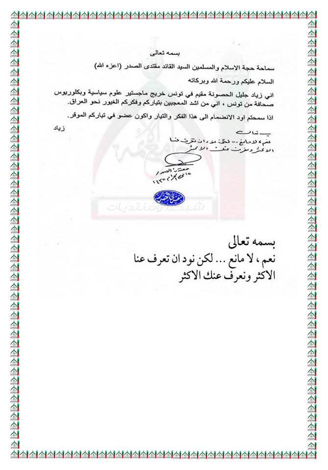 رغبة احد المقيمين في تونس الانضمام الى فكر آل الصدر استفتاء السيد القائد مقتدى الصدر اعزه الله 21 - 11 - 2013