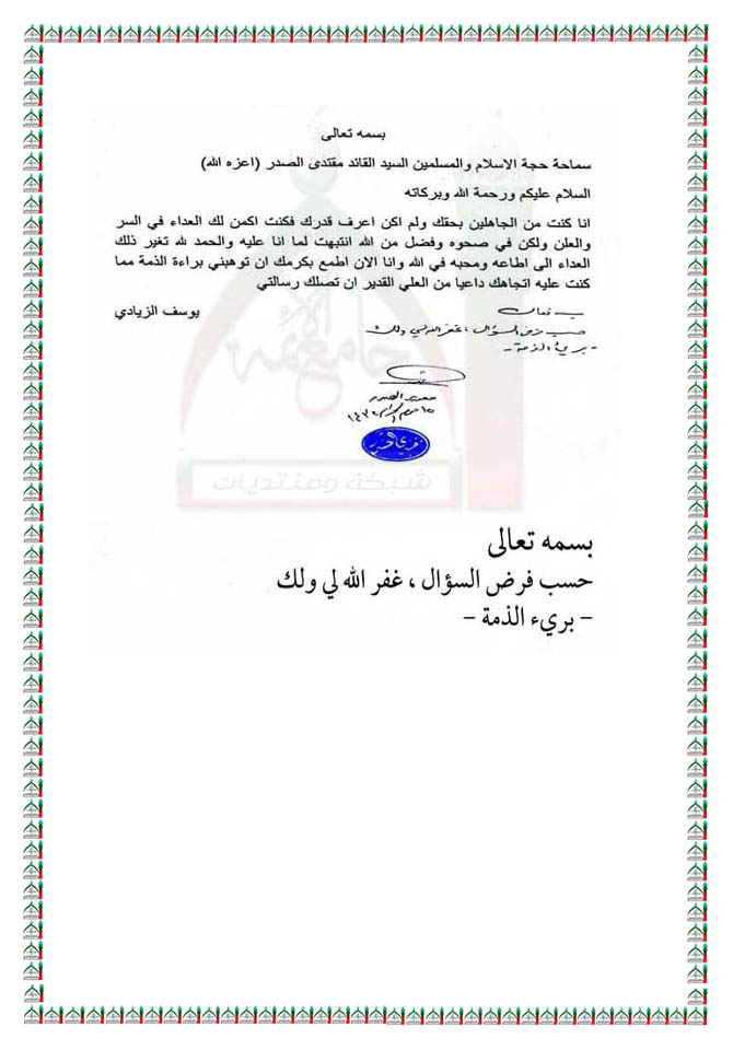 طلب براءة ذمة من احد الجاهلين بحق سماحته استفتاء السيد القائد مقتدى الصدر اعزه الله 21 - 11 - 2013