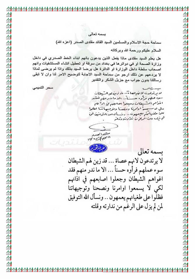 بعض المنتسبين في وزارة الصحة ودوائرها ممن يشوه سمعة الخط الصدري الشريف استفتاء السيد القائد مقتدى الصدر اعزه الله 21 - 11 - 2013