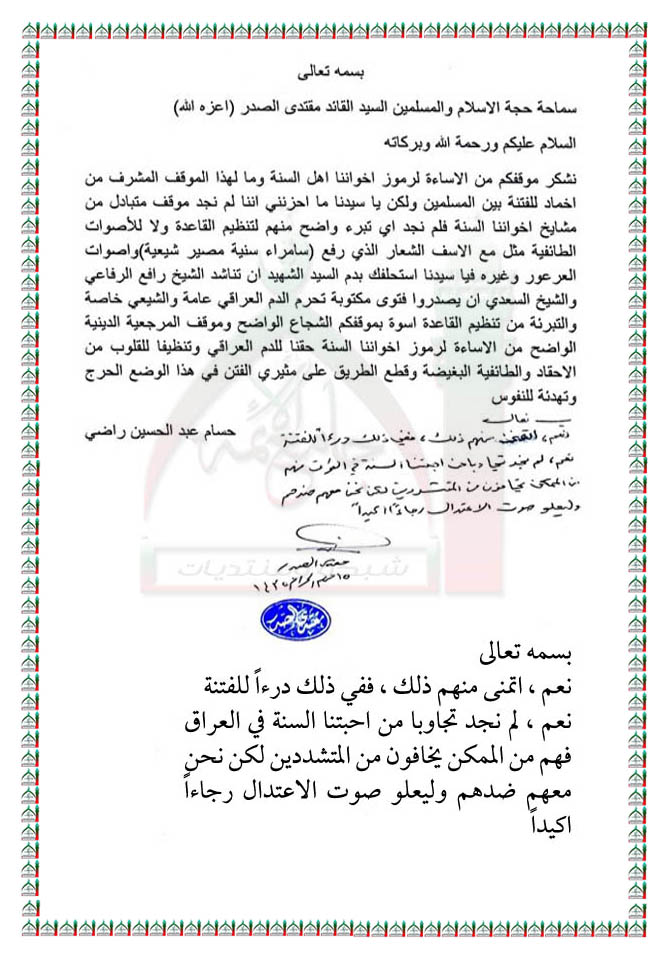 مناشدة علماء السنة بالبراءة من تنظيم القاعدة التكفيري استفتاء السيد القائد مقتدى الصدر اعزه الله 21 - 11 - 2013