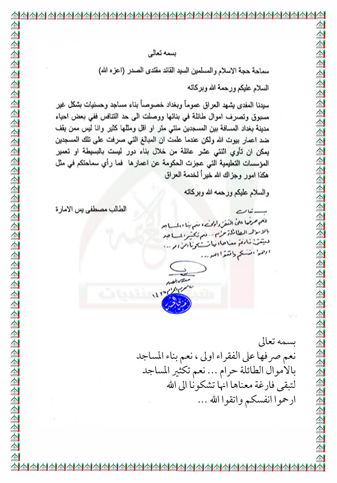 بناء المساجد والحسينيات استفتاء السيد القائد مقتدى الصدر اعزه الله 26 - 11 - 2013