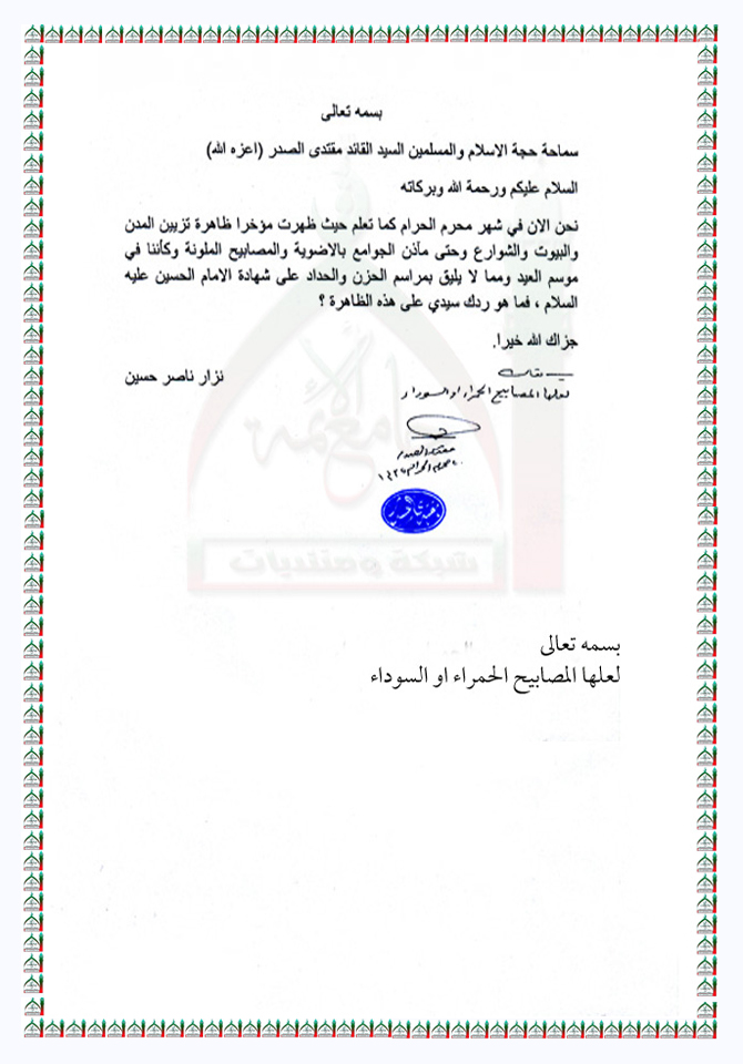 استخدام المصابيح الملونة في المساجد استفتاء السيد القائد مقتدى الصدر اعزه الله 26 - 11 - 2013