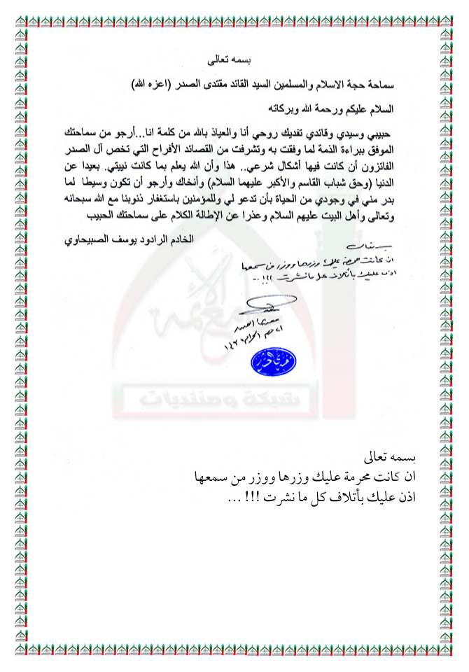 طلب براءة الذمه مقدم من قبل المنشد يوسف الصبيحاوي استفتاء السيد القائد مقتدى الصدر اعزه الله 27 - 11 - 2013