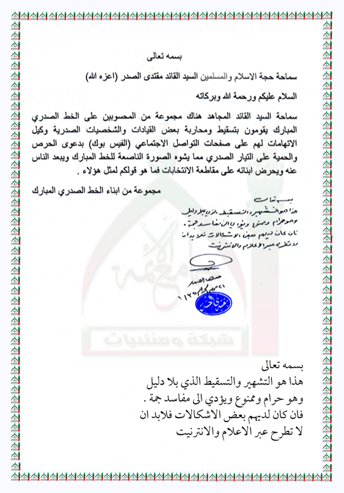 التسقيط والاتهامات عبرالاعلام و الانترنت استفتاء السيد القائد مقتدى الصدر اعزه الله 27 - 11 - 2013
