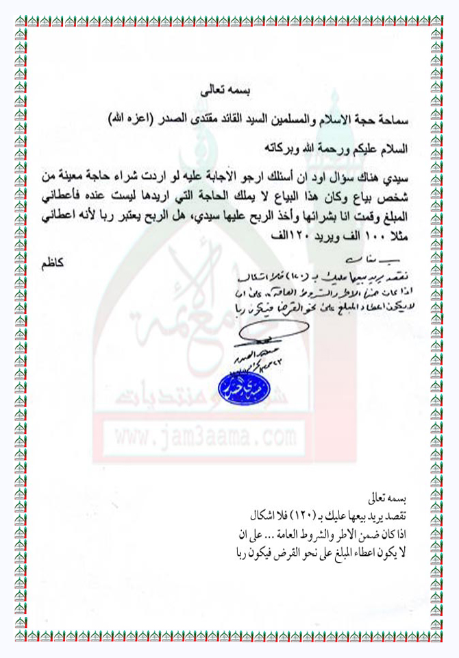 الربح الحاصل من جراء معاملة البيع بالآجل استفتاء السيد القائد مقتدى الصدر اعزه الله 28 - 11 - 2013