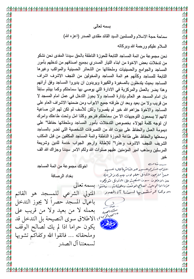 مجموعة من أئمة المساجد يشكون تدخلات البعض بشؤون التولية استفتاء السيد القائد مقتدى الصدر اعزه الله 1 - 12 - 2013