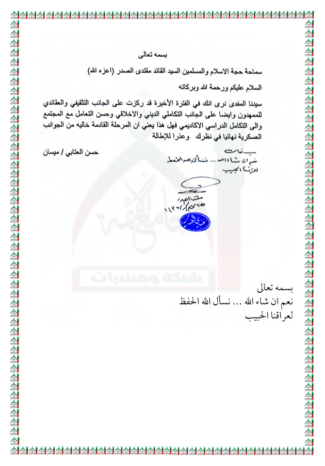 الجانب التثقيفي و العقائدي لـ ( الممهدون ) وضرورة التركيز على جانب التكامل الديني والاخلاقي السيد القائد مقتدى الصدر اعزه الله 1 - 12 - 2013