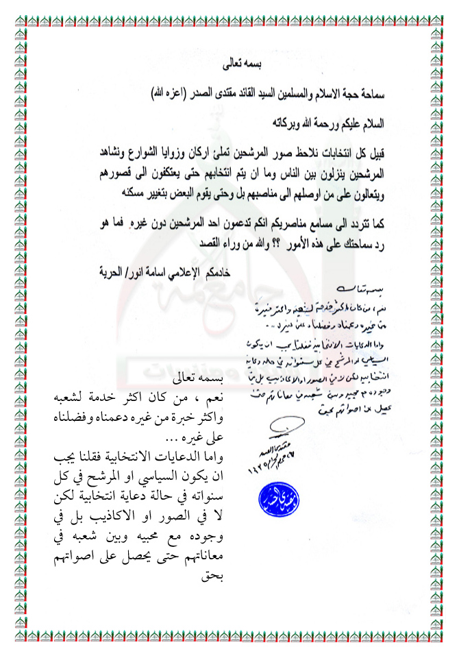 الدعاية الانتخابية للمرشحين استفتاء السيد القائد مقتدى الصدر اعزه الله 3 - 12 - 2013