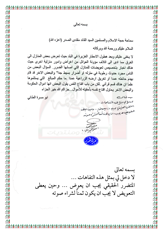 يجب تعويض المتضرر الحقيقي من الامطار استفتاء السيد القائد مقتدى الصدر اعزه الله 7 - 12 - 2013