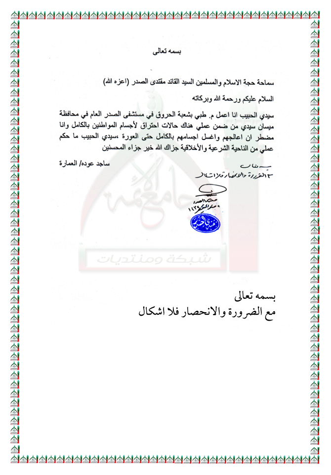 معالجة وغسل اجسام المصابين بالكامل في قسم معالجة الحروق استفتاء السيد القائد مقتدى الصدر اعزه الله 7 - 12 - 2013