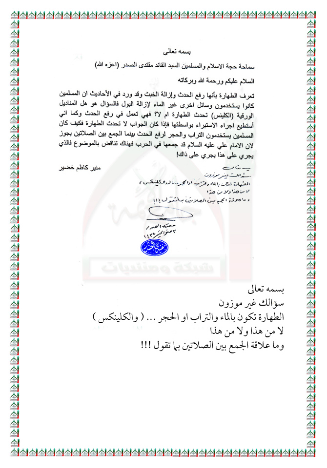 الطهارة بالماء والتراب او الحجر استفتاء السيد القائد مقتدى الصدر اعزه الله 9 - 12 - 2013