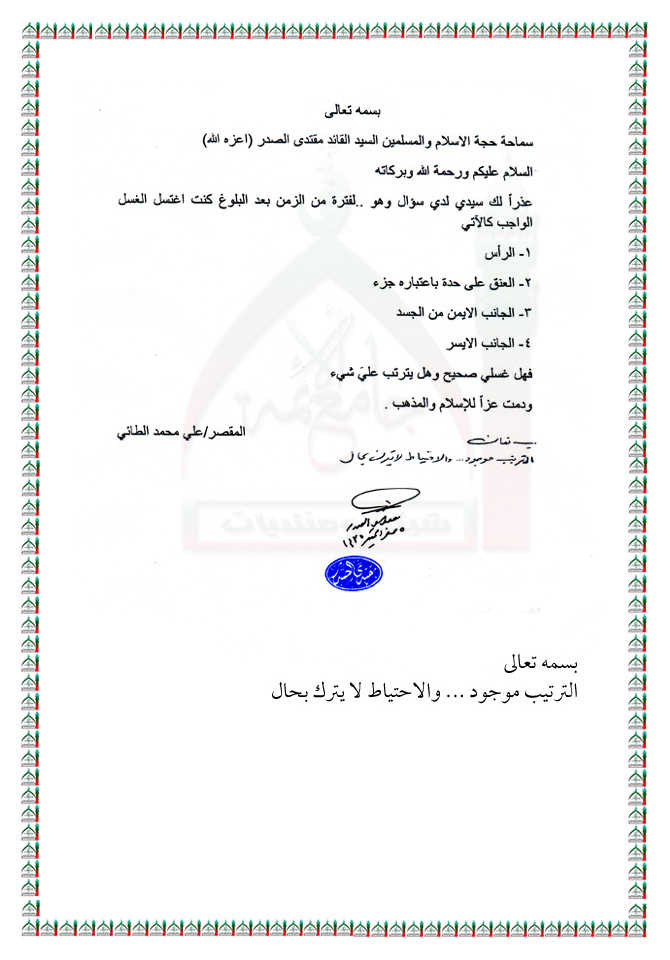 مسألة حول الغسل استفتاء السيد القائد مقتدى الصدر اعزه الله 10 - 12 - 2013