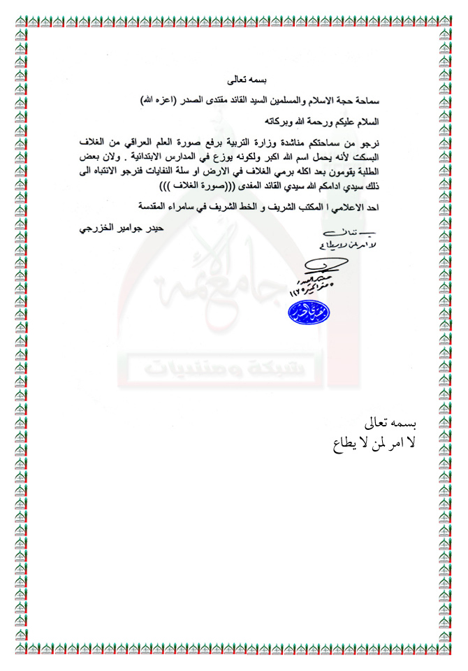 وجود لفظ الجلالة على مادة البسكت التي توزع على بعض المدارس من قبل وزارة التربية استفتاء السيد القائد مقتدى الصدر اعزه الله 10 - 12 - 2013