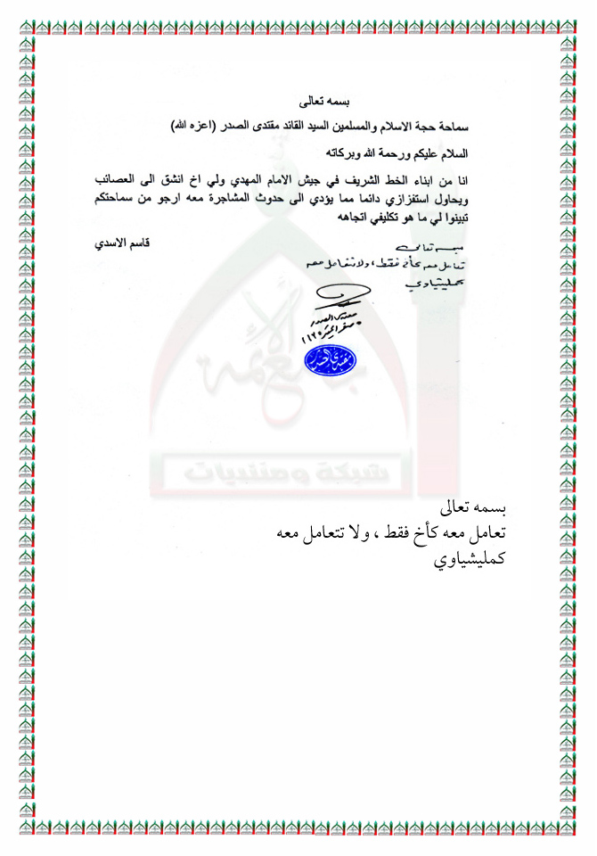 كيفية تعامل أخ مع أخيه منتمي للعصائب استفتاء السيد القائد مقتدى الصدر اعزه الله 10 - 12 - 2013