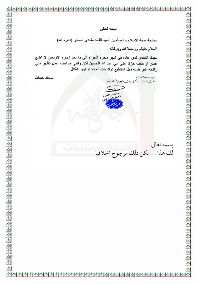 شخص من عادته لايضع العطر في شهر محرم الحرام استفتاء السيد القائد مقتدى الصدر اعزه الله 11 - 12 - 2013
