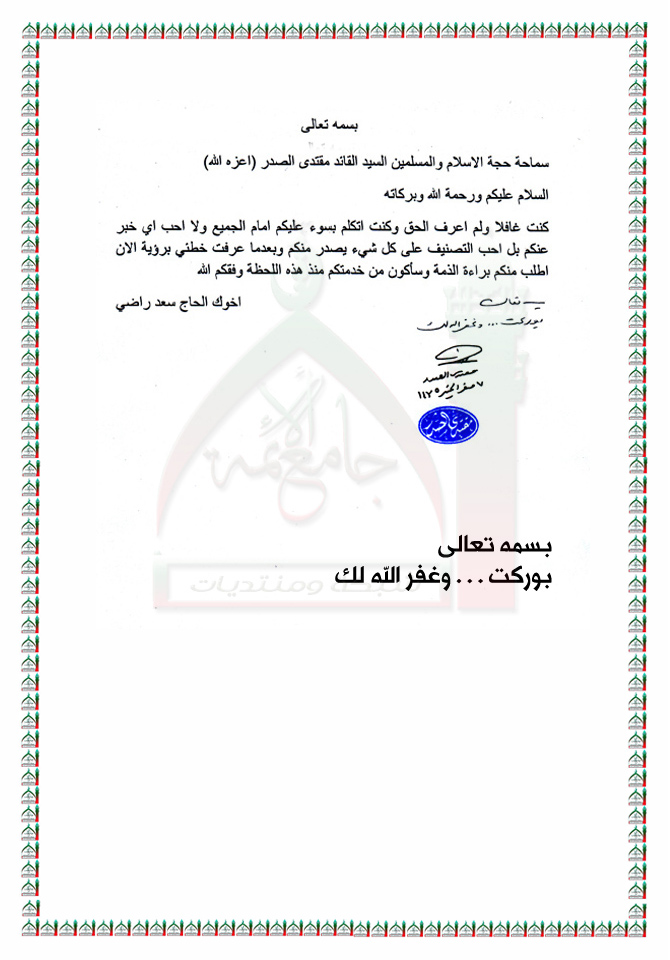 طلب براءة الذمة من سماحته استفتاء السيد القائد مقتدى الصدر اعزه الله 11 - 12 - 2013