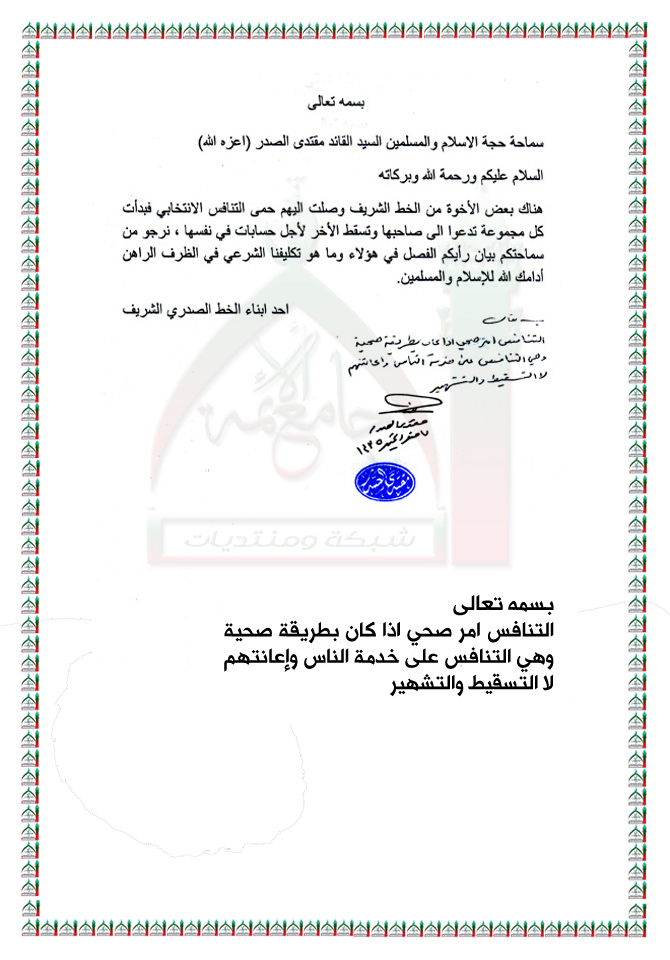 التنافس الانتخابي المبني على التسقيط والتشهير استفتاء السيد القائد مقتدى الصدر اعزه الله 12 - 12 - 2013