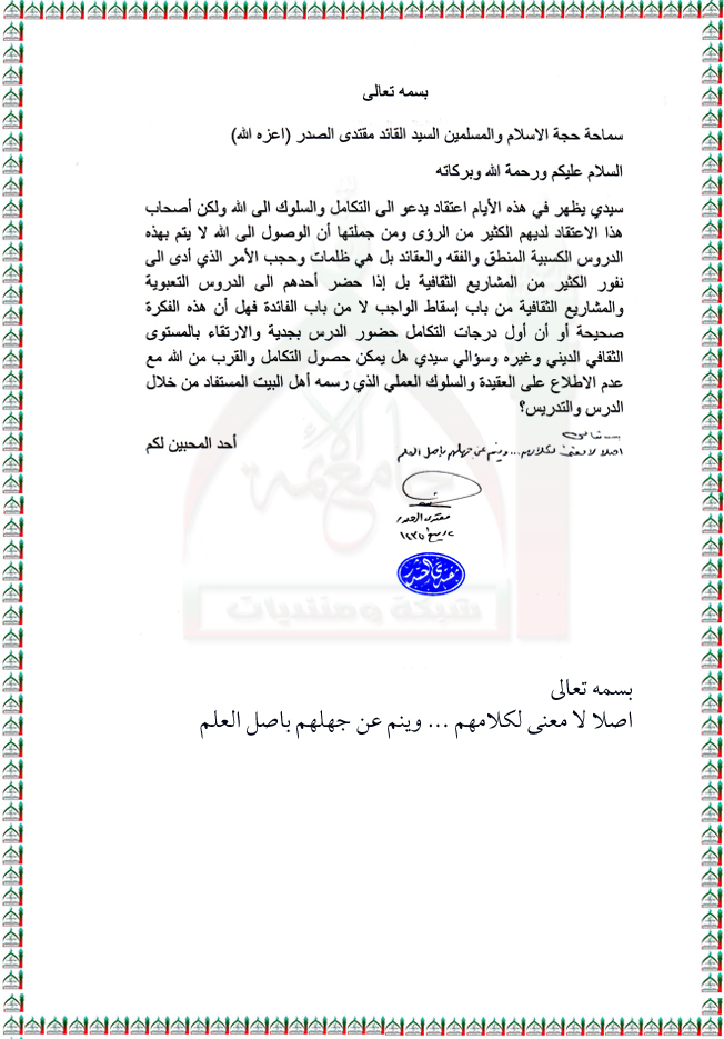 اعتقاد البعض بأن الوصول الى الله سبحانه وتعالى لايتم من خلال الدروس الكسبية كالمنطق والفقه والعقائد استفتاء السيد القائد مقتدى الصدر اعزه الله 6 - 1 - 2014