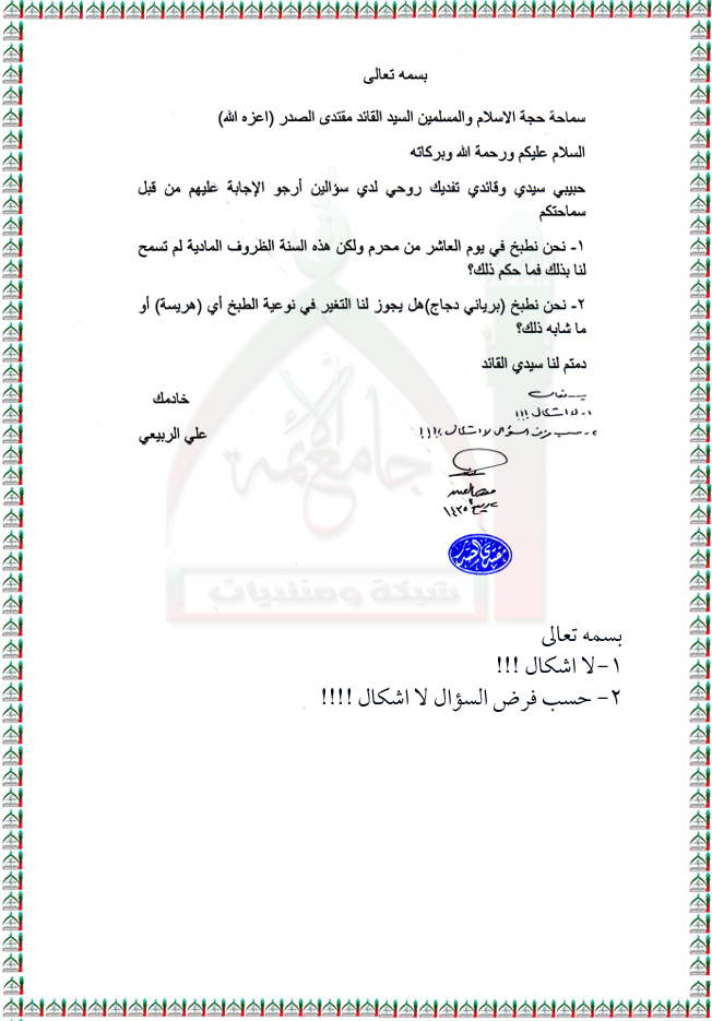 عدم المقدرة المادية على الطبخ في شهر محرم الحرام او تغيير نوعية الطبخ استفتاء السيد القائد مقتدى الصدر اعزه الله 6 - 1 - 2014