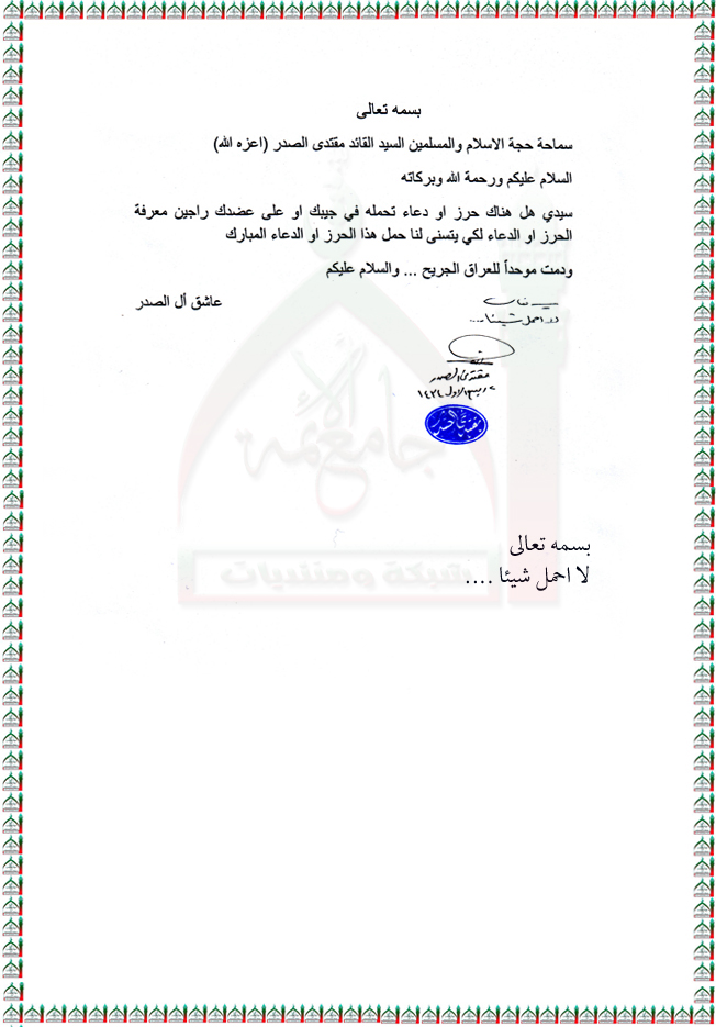 الحرز الذي يحمله سماحته في جيبه او على عضده استفتاء السيد القائد مقتدى الصدر اعزه الله 6 - 1 - 2014