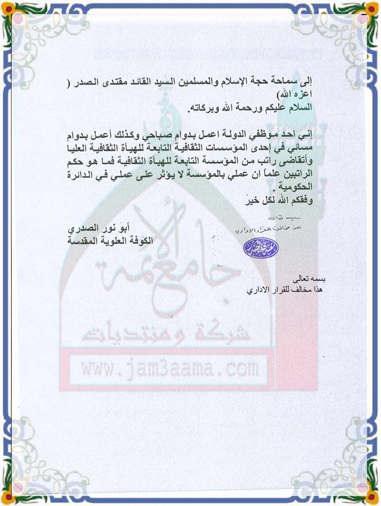 استفتاء للسيد القائد مقتدى الصدر حول الجمع بين الوظيفة والعمل بالمكتب الشريف 7-11