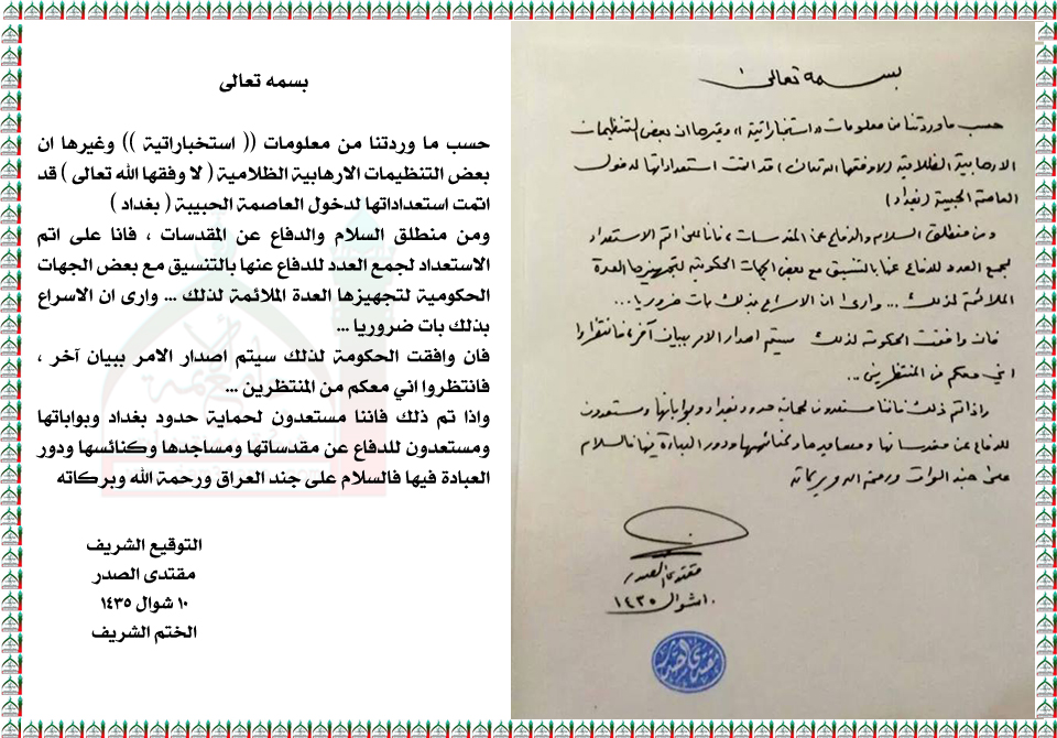 معلومات عن استهداف العاصمة بغداد واعلان سماحته استعداده لحمايتها بيان السيد القائد مقتدى الصدر اعزه الله 8 - 8 - 2014