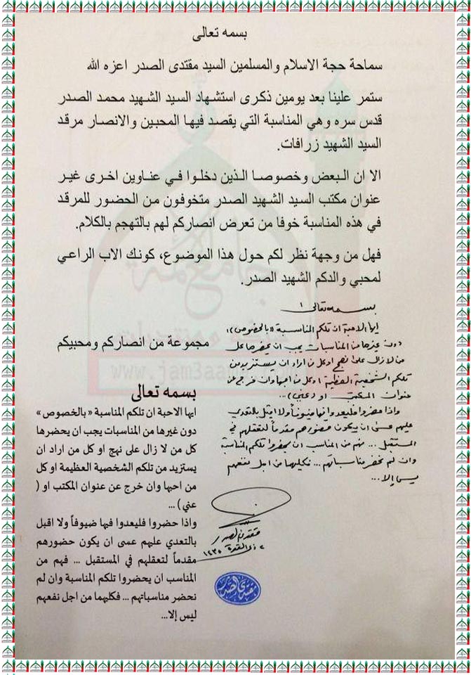 احياء ذكرى استشهاد السيد الشهيد الصدر قدس وحضورها من قبل المنضوين تحت عناوين اخرى استفتاء السيد القائد مقتدى الصدر اعزه الله 29 - 8 - 2014