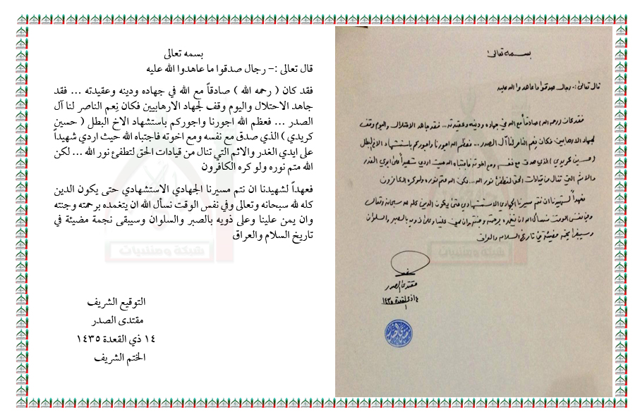 استشهاد الاخ البطل حسين كريدي بيان السيد القائد مقتدى الصدر اعزه الله 10 - 9 - 2014