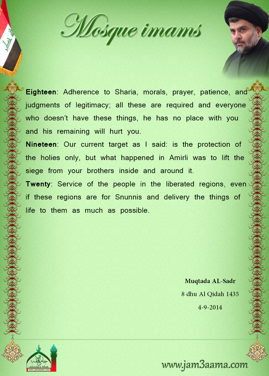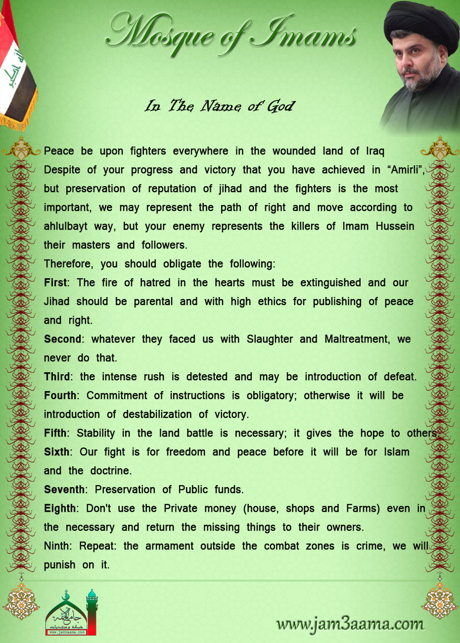 Instructions to Peace Brigades - A Statement of Al-Sayed Muqtada Al-Sadr 4-9-2014.