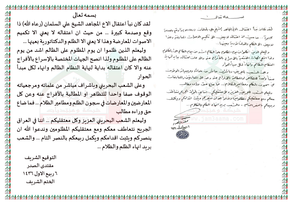 اعتقال الشيخ المجاهد علي السلمان بيان السيد القائد مقتدى الصدر اعزه الله 29 - 12 - 2014