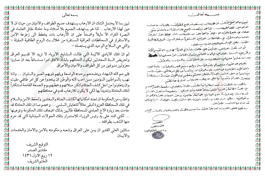 حادثة مقتل العلماء في البصرة بيان السيد القائد مقتدى الصدر اعزه الله 3 - 1 - 2015
