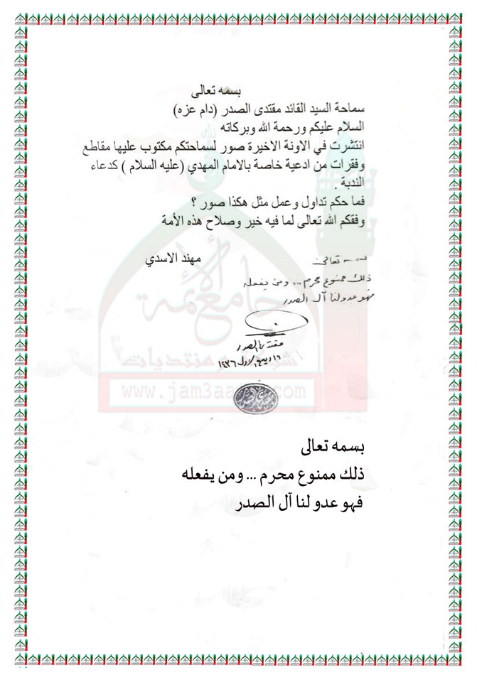 حكم تداول وعمل صور للسيد القائد مكتوب عليها مقاطع وفقرات من ادعية خاصة بالإمام المهدي (عج) استفتاء السيد القائد مقتدى الصدر اعزه الله 9 - 1 - 2015