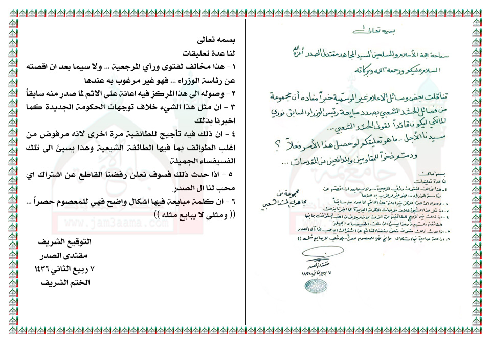 ماتناقلته بعض وسائل الإعلام الغير رسمية عن خبر مبايعة رئيس الوزراء السابق من قبل مجموعة من فصائل الحشد الشعبي استفتاء السيد القائد مقتدى الصدر اعزه الله 29 - 1 - 2015