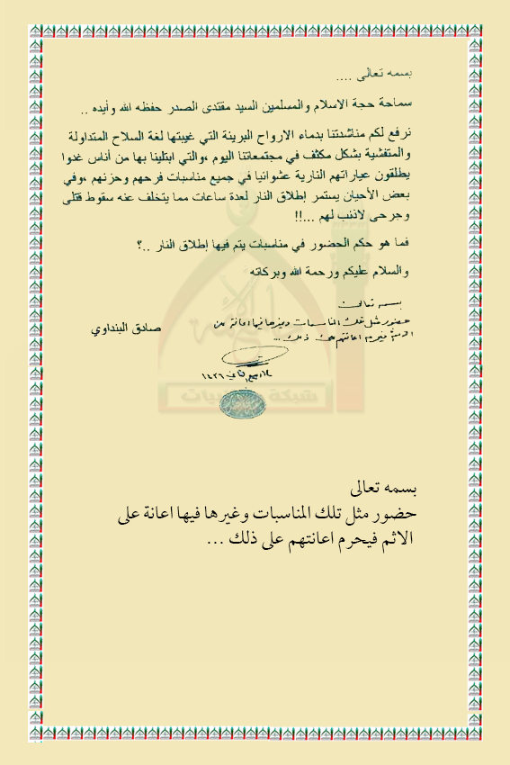 حضور المناسبات التي يطلق فيها العيارات النارية استفتاء السيد القائد مقتدى الصدر اعزه الله 5 - 2 - 2015