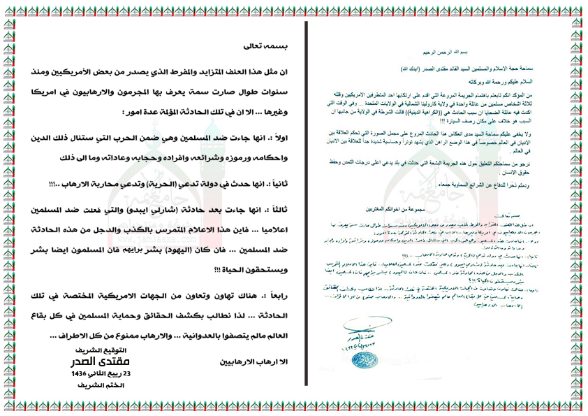 حادثة قتل ثلاثة من المسلمين على ايدي احد المتطرفين الامريكيين استفتاء السيد القائد مقتدى الصدر 13 - 2 - 2015