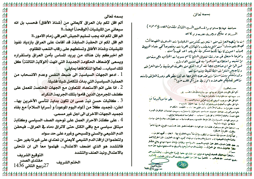 مايشهده العراق من انفلات لكثير من المليشيات وحالات القتل وتأجيج للفتنة الطائفية استفتاء السيد القائد مقتدى الصدر 17 - 2- 2015