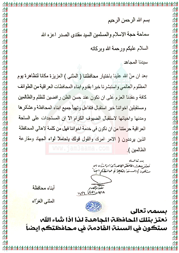 تغيير مكان مظاهرة يوم المظلوم من محافظة المثنى الى صلوات الجمعة في عموم العراق استفتاء السيد القائد مقتدى الصدر اعزه الله 10 - 3 - 2015