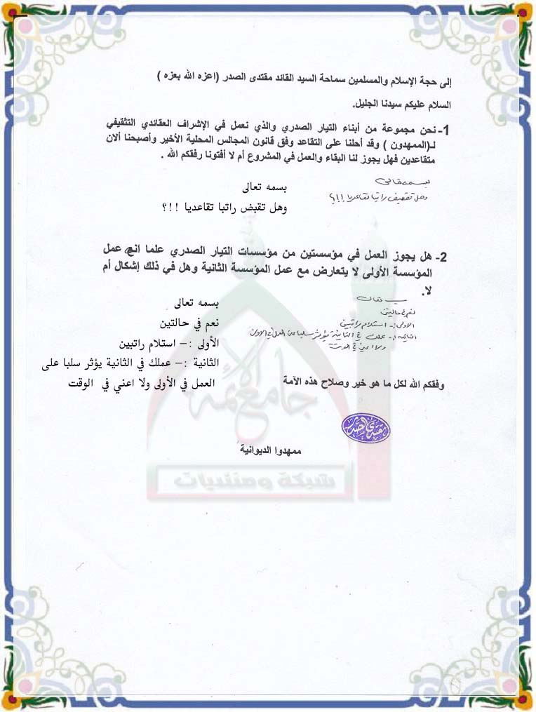 العاملين في مؤسسات التيار الصدري(استفتاء للسيد القائد بتاريخ 23-3-2011)