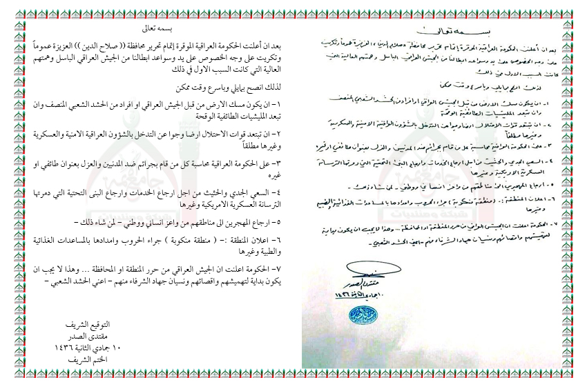 اصدر سماحة السيد القائد مقتدى الصدر اعزه الله بيانا تضمن عدة نصائح بعد ما اعلنت الحكومة العراقية إتمام تحرير محافظة صلاح الدين بشكل عام وتكريت على وجه الخصوص على ان يكون تنفيذها باسرع وقت ممكن