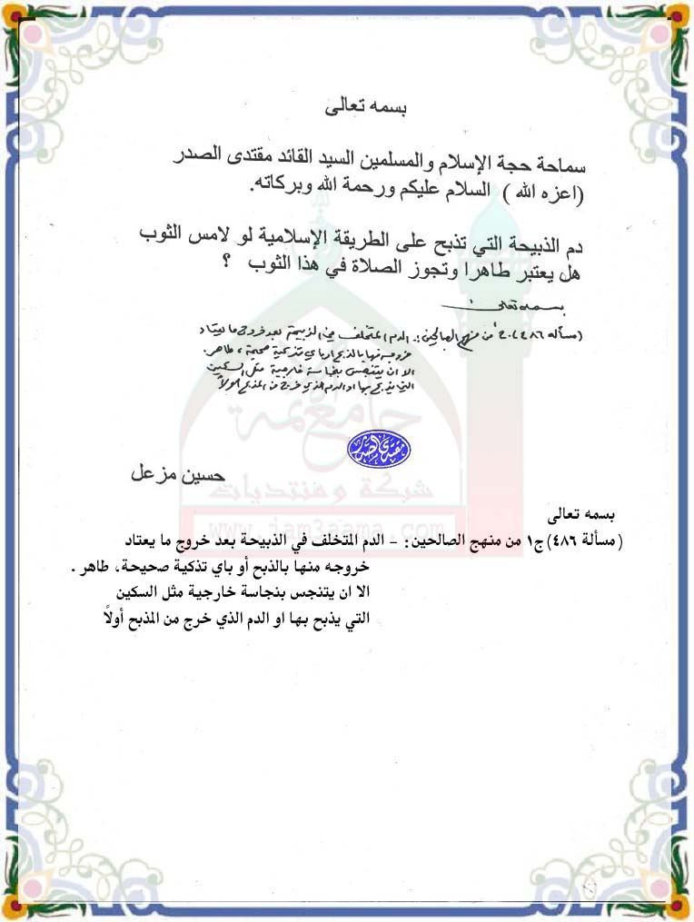 طهارة الدم المتخلف في الذبيحة(استفتاء للسيد القائد بتاريخ 24-3-2011)